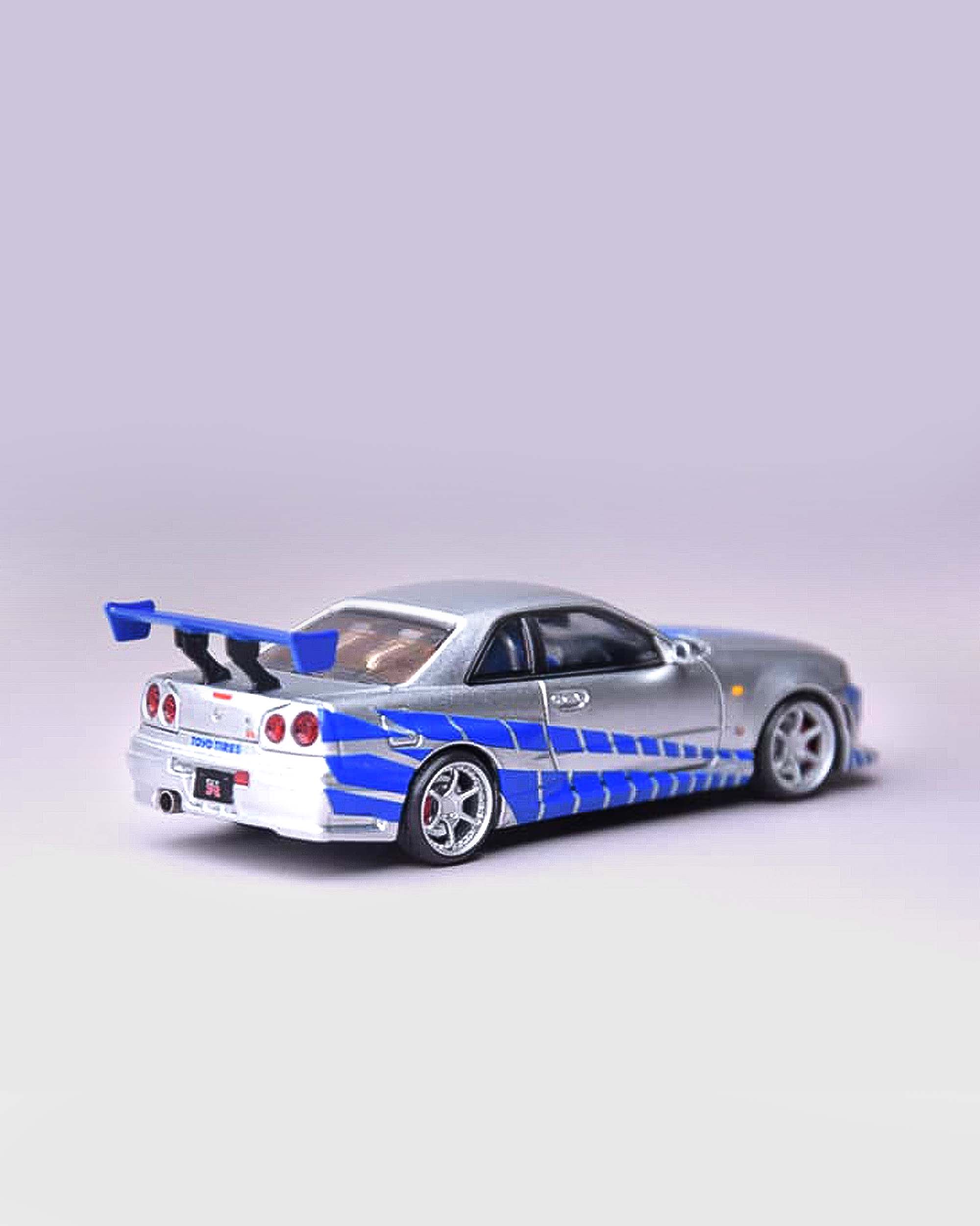 - Xe sở hữu lớp sơn đặc trưng Silver-Blue Livery lấy cảm hứng từ chiếc R34 của Brian O’Conner (Paul Walker) trong loạt phim Fast & Furious, kết hợp với các chi tiết độ như: widebody C-West, mâm thể thao, cánh gió lớn, pô độ và lưới tản nhiệt thể thao. Toàn bộ đều được thể hiện sắc sảo, chuẩn tỉ lệ và đậm chất xe đua đường phố.