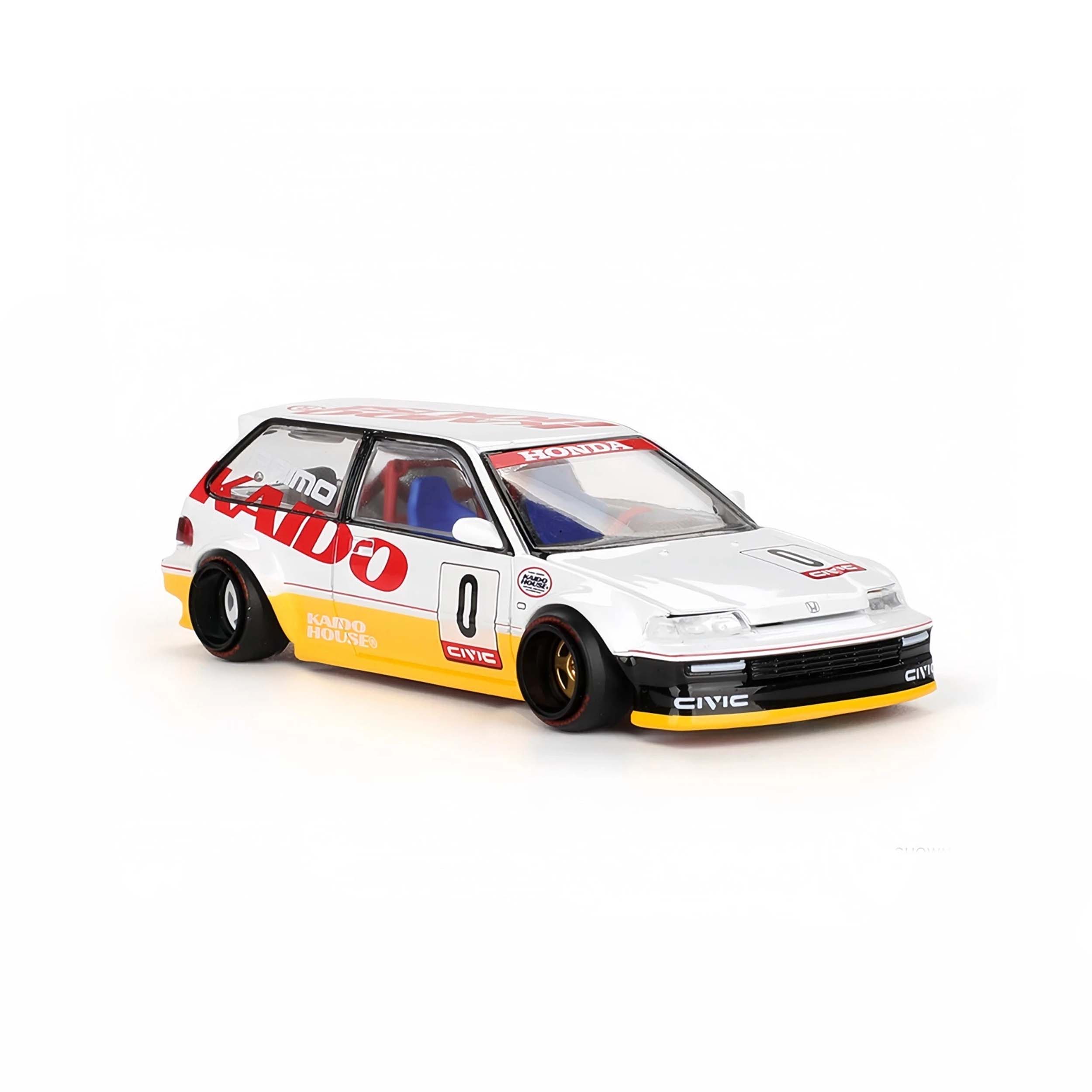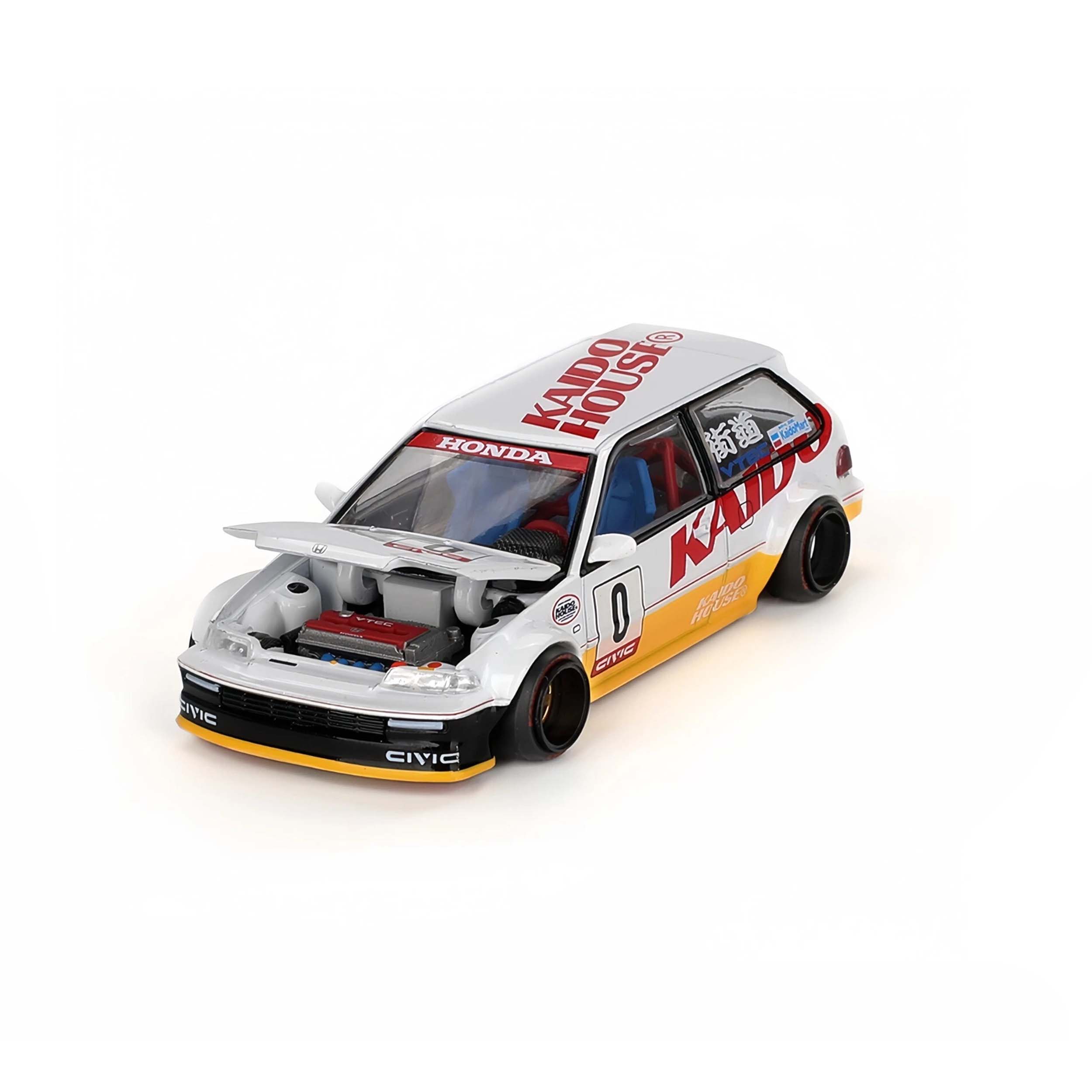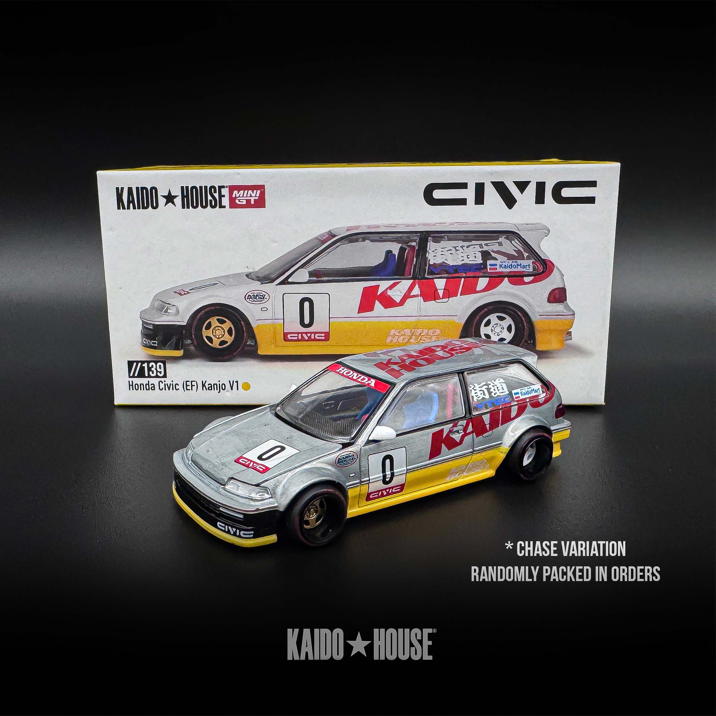 Mô hình xe tỉ lệ 1:64 do Kaido House hợp tác cùng Mini GT sản xuất, mang mã KHMG139, tái hiện mẫu Honda Civic (EF) Kanjo V1, một thiết kế hoàn toàn mới trong dòng Kaido Works Kanjo Series do Jun Imai sáng tạo. Thân xe được chế tác từ hợp kim kim loại (die-cast) kết hợp các chi tiết nhựa tinh xảo, mang lại cảm giác sắc nét và độ hoàn thiện cực cao. Kích thước dài khoảng 7,2 cm, phù hợp để trưng bày hoặc sưu tầm chuyên nghiệp.
