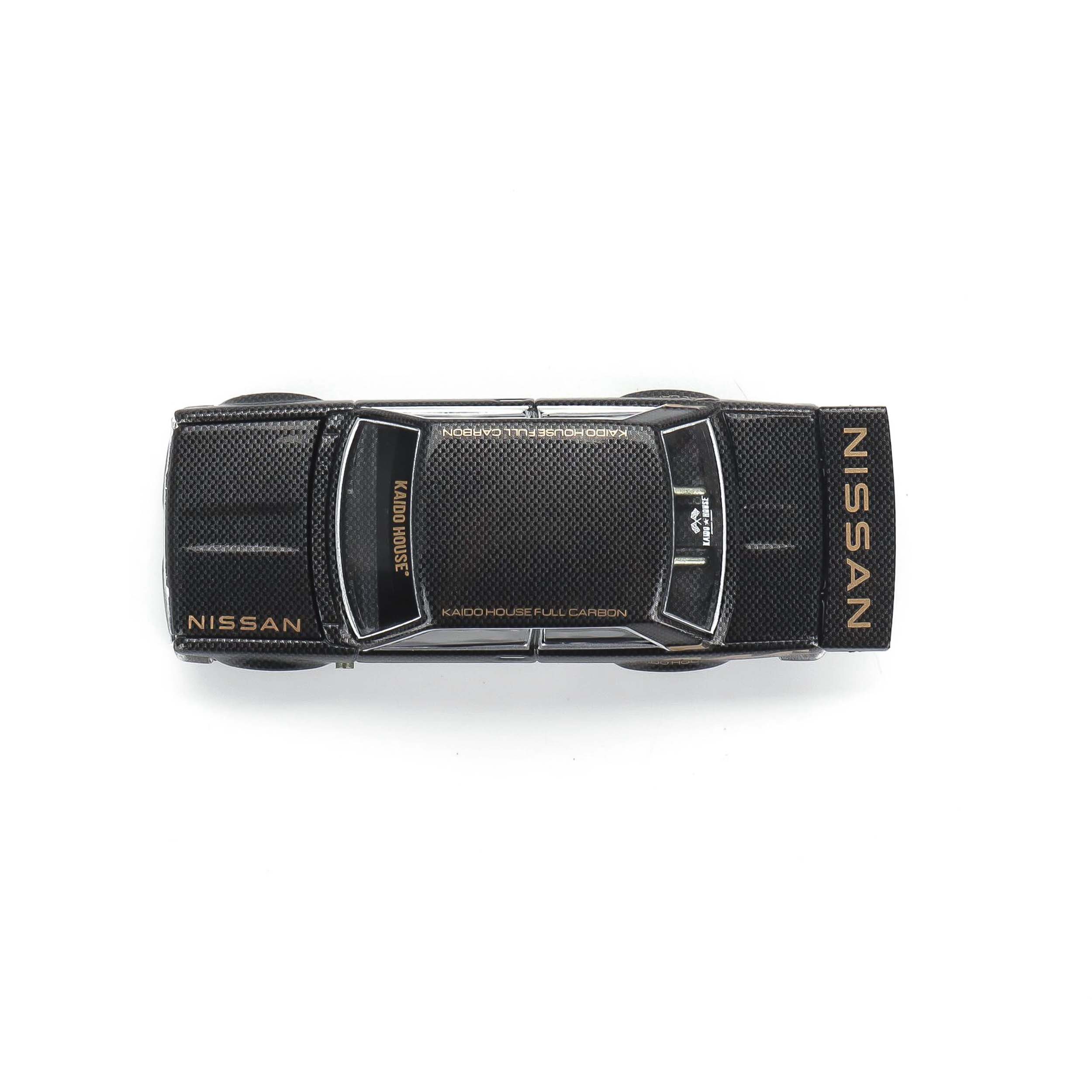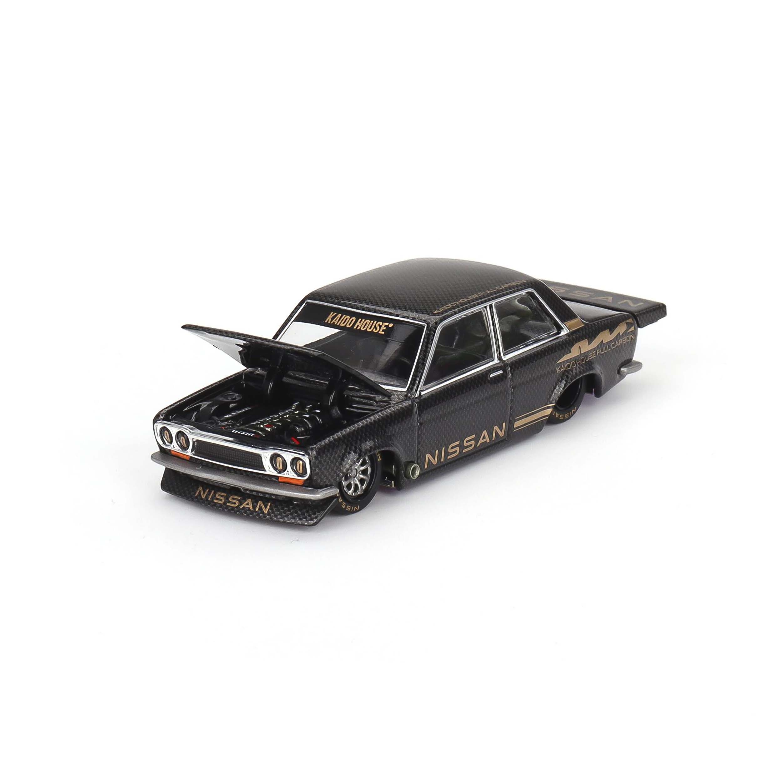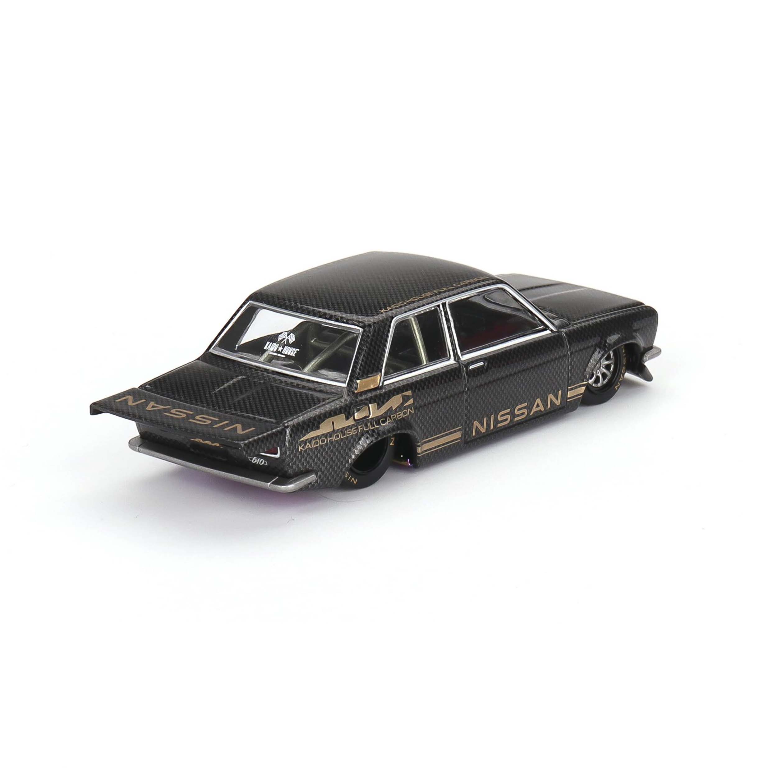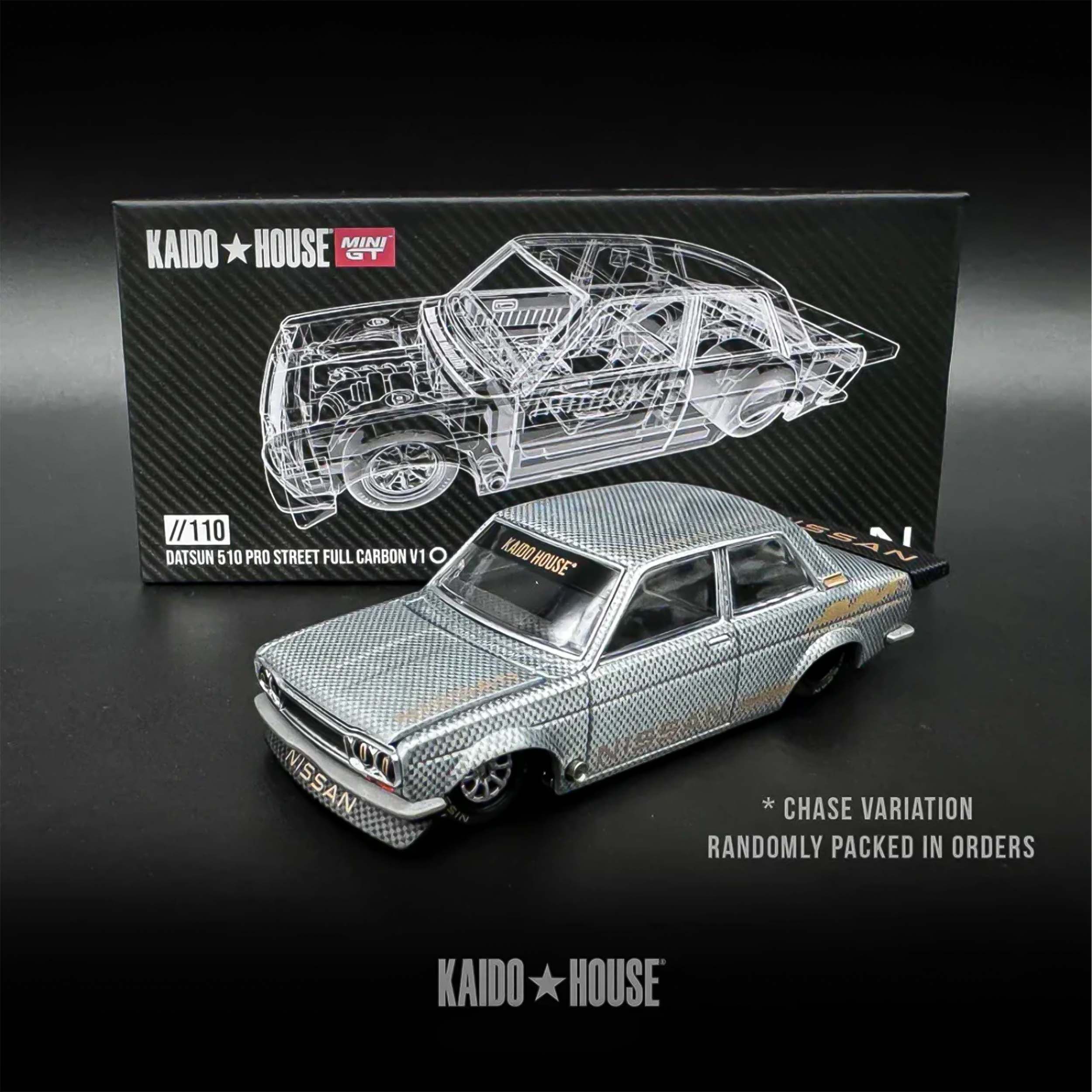 Mô hình xe tỉ lệ 1:64 do Kaido House hợp tác cùng Mini GT sản xuất, mang mã KHMG110, tái hiện mẫu Datsun 510 Pro Street Full Carbon V1 – thiết kế biểu tượng của Jun Imai, người sáng lập Kaido House. Thân xe được chế tác từ hợp kim kim loại (die-cast) kết hợp các chi tiết nhựa tinh xảo, mang lại cảm giác sắc nét và độ hoàn thiện cao. Kích thước dài khoảng 7,5 cm, phù hợp để trưng bày hoặc sưu tầm.