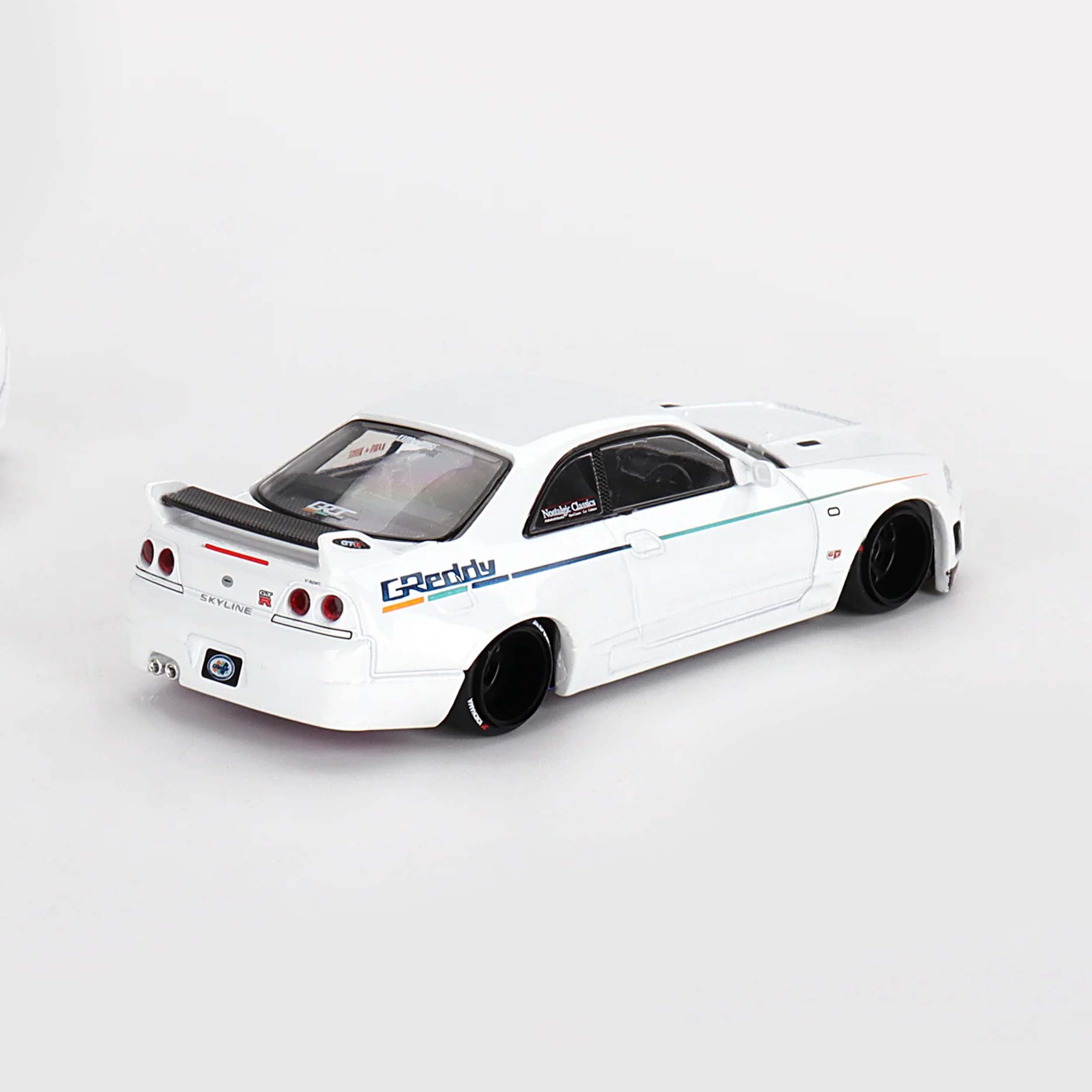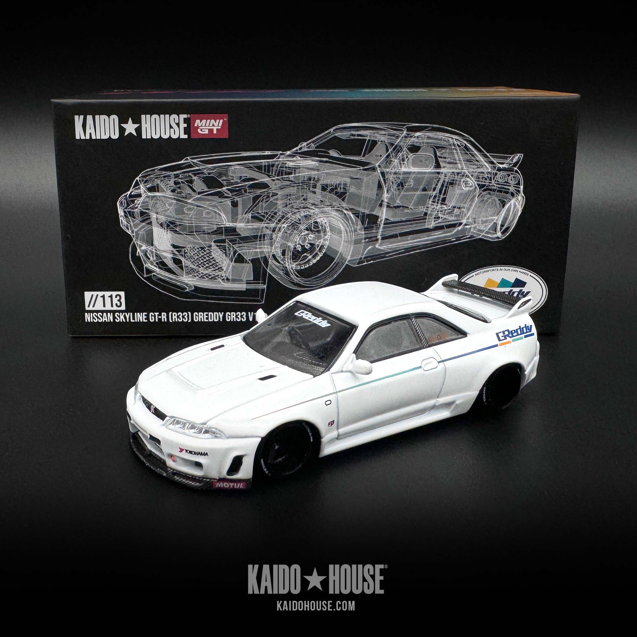 - Chiếc mô hình tỉ lệ 1:64 thuộc dòng sản phẩm cao cấp từ Kaido House, kết hợp sản xuất với Mini GT, tái hiện mẫu Nissan Skyline GT-R R33 theo phong cách độ GReddy – phiên bản GR33 V1.