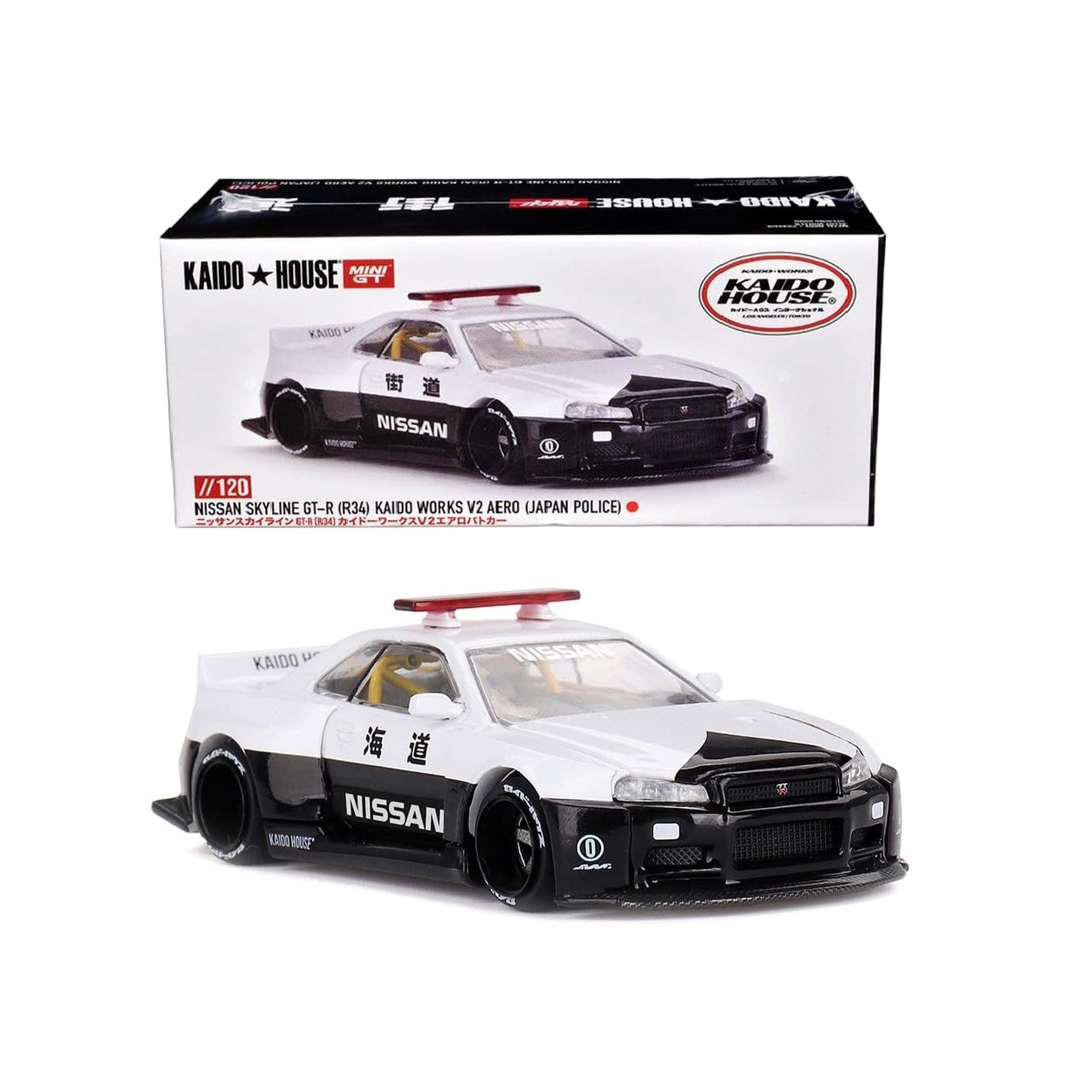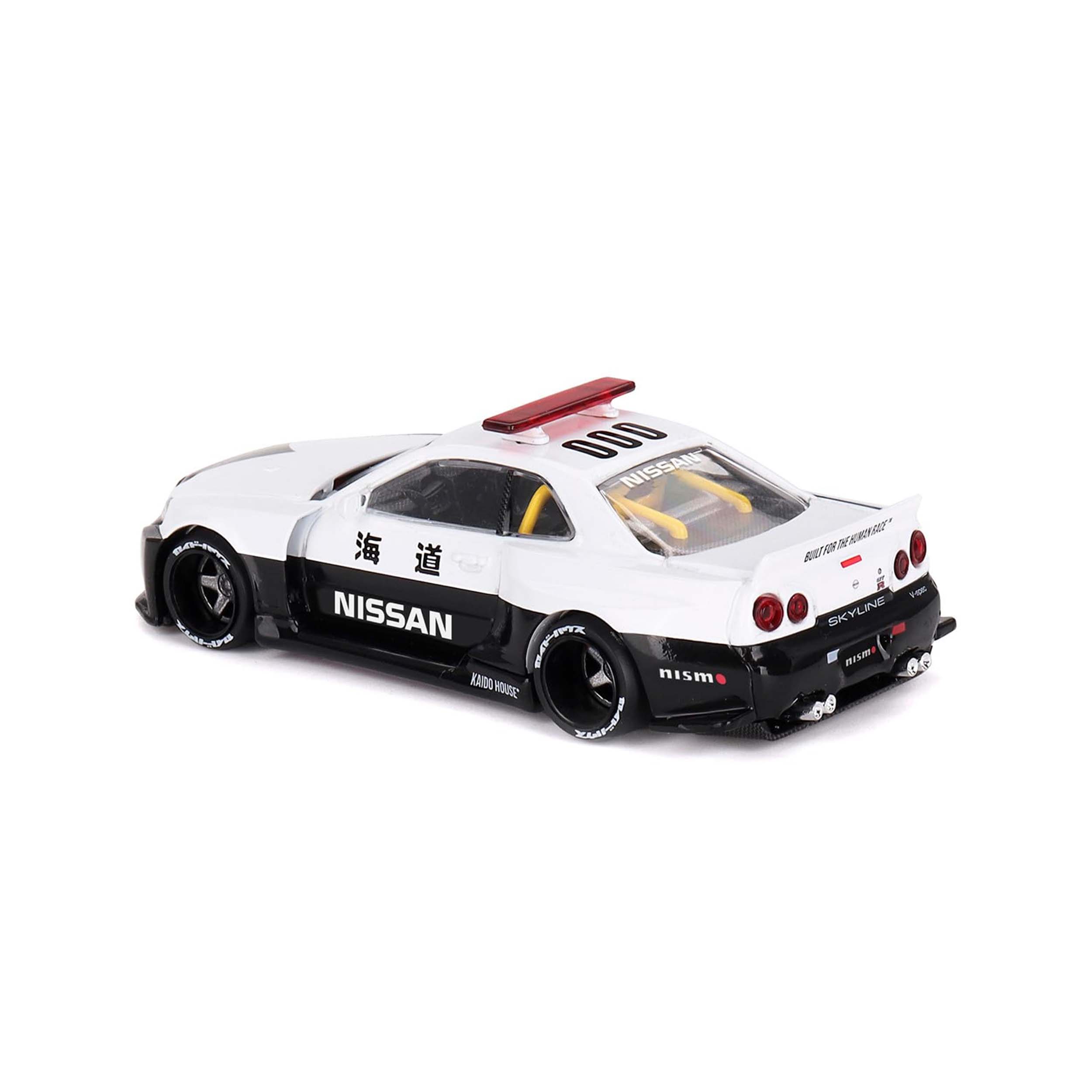 - Phiên bản Nissan Skyline GT-R R34 “Police” nổi bật với thiết kế widebody cá tính, kết hợp màu sơn trắng – đen đặc trưng cảnh sát Nhật Bản, đi kèm thanh đèn nóc đỏ và họa tiết “POLICE” mạnh mẽ. Bánh xe có thể xoay, lốp cao su thật, nắp capo mở được, gầm xe mạ màu chi tiết – tăng tính tương tác và giá trị sưu tầm.