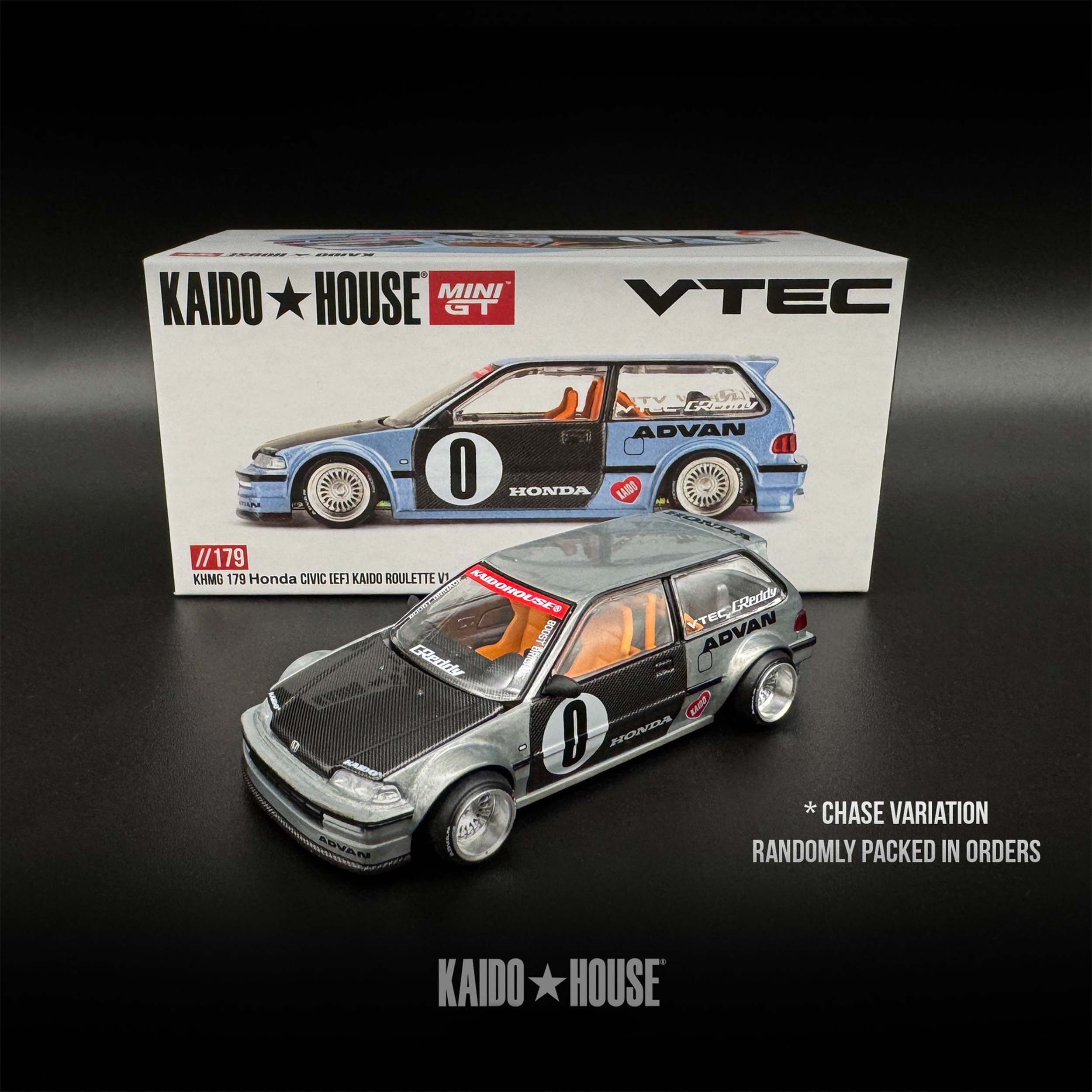 Mô hình xe tỉ lệ 1:64 do Kaido House hợp tác cùng Mini GT sản xuất, mang mã KHMG179, tái hiện chiếc Honda Civic EF với phong cách độ Kaido Works “Roulette V1”.