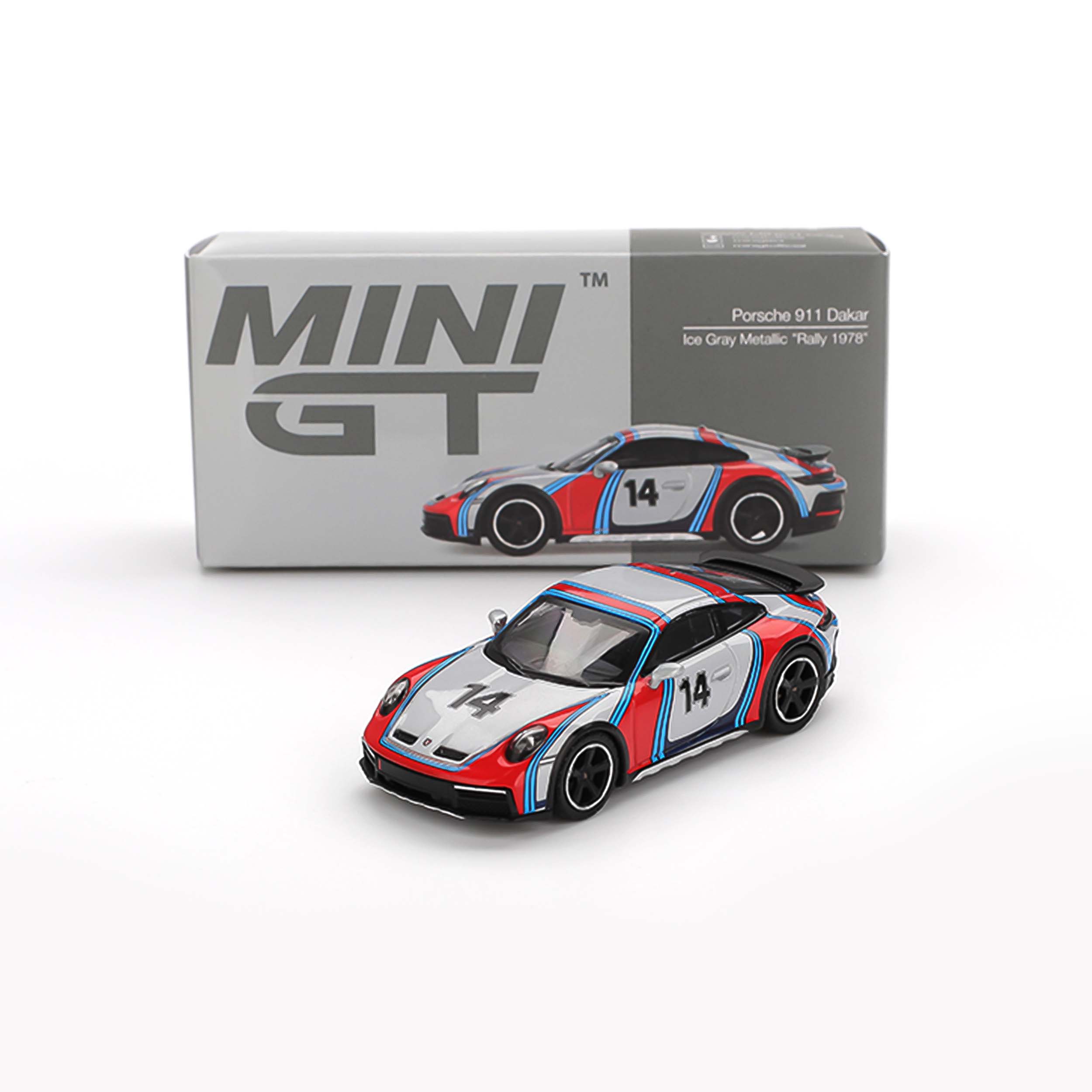 Mô hình xe tỉ lệ 1:64 do Mini GT sản xuất, thuộc phiên bản Box Version MGT00964, tái hiện chiếc Porsche 911 Dakar “Rally 1978” trong màu sơn Ice Grey Metallic. Mô hình được chế tác từ hợp kim kim loại (die-cast) kết hợp các chi tiết nhựa tinh xảo, mang lại cảm giác chắc tay, bền bỉ và sắc nét đến từng chi tiết. Kích thước dài khoảng 7,5 cm, thích hợp để trưng bày hoặc sưu tầm.