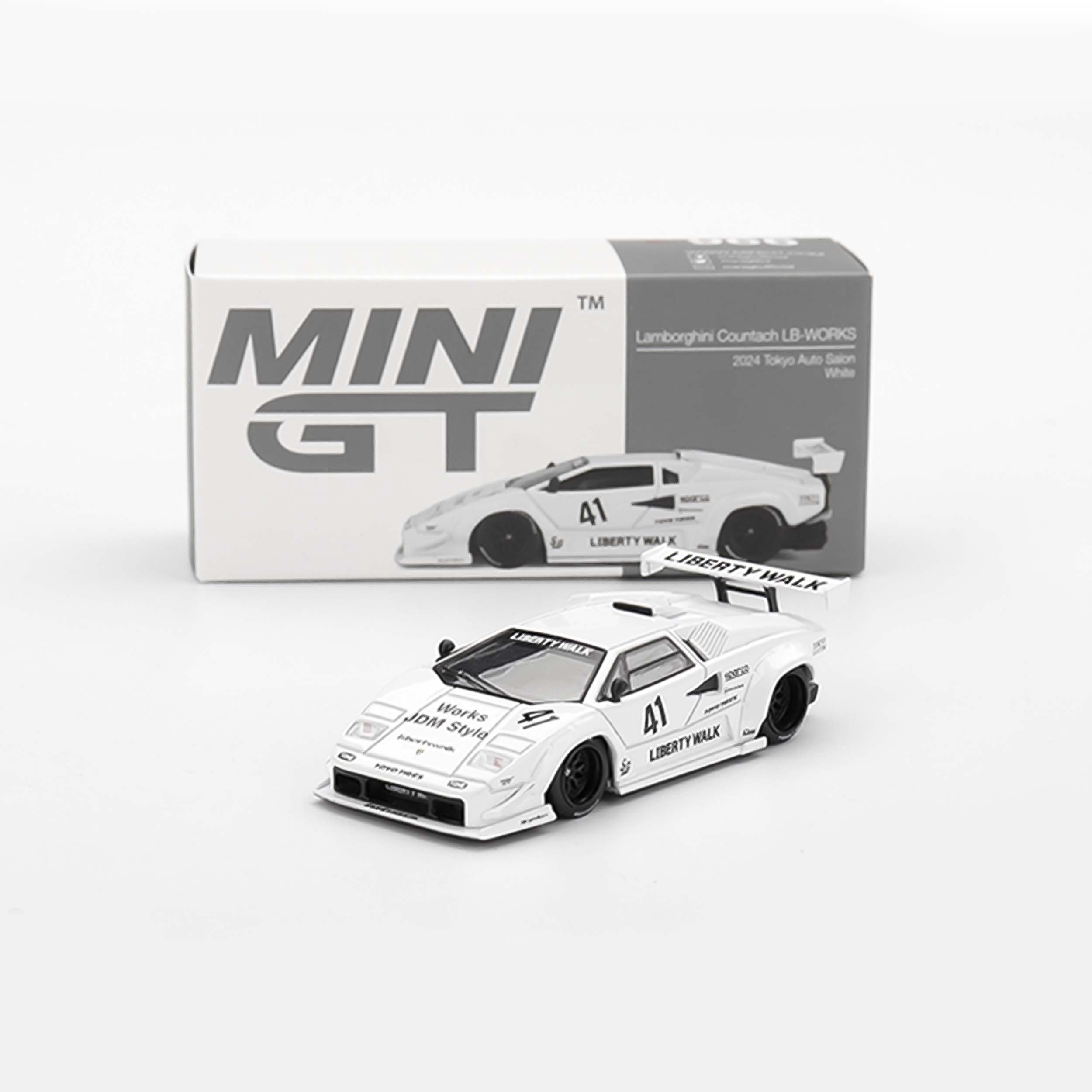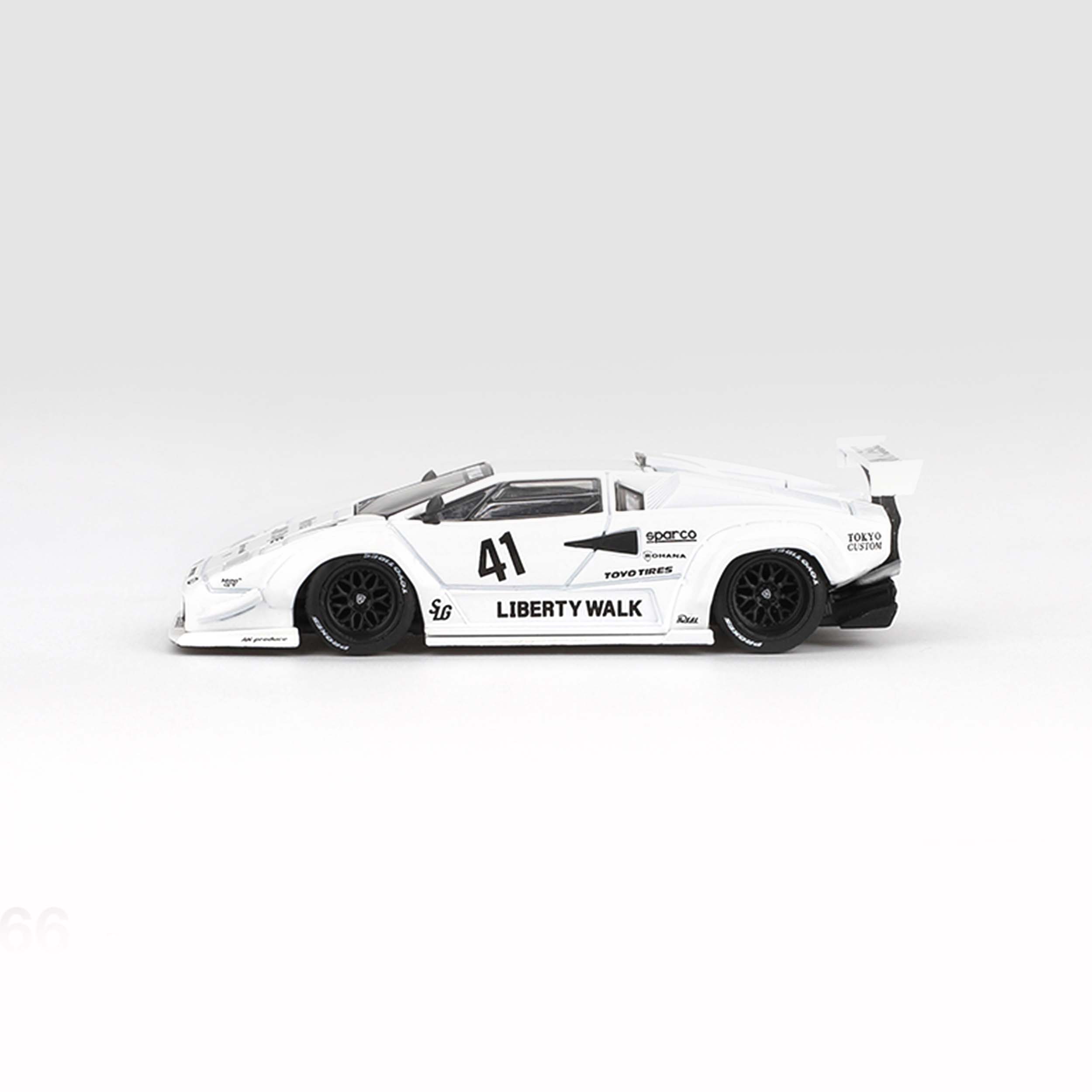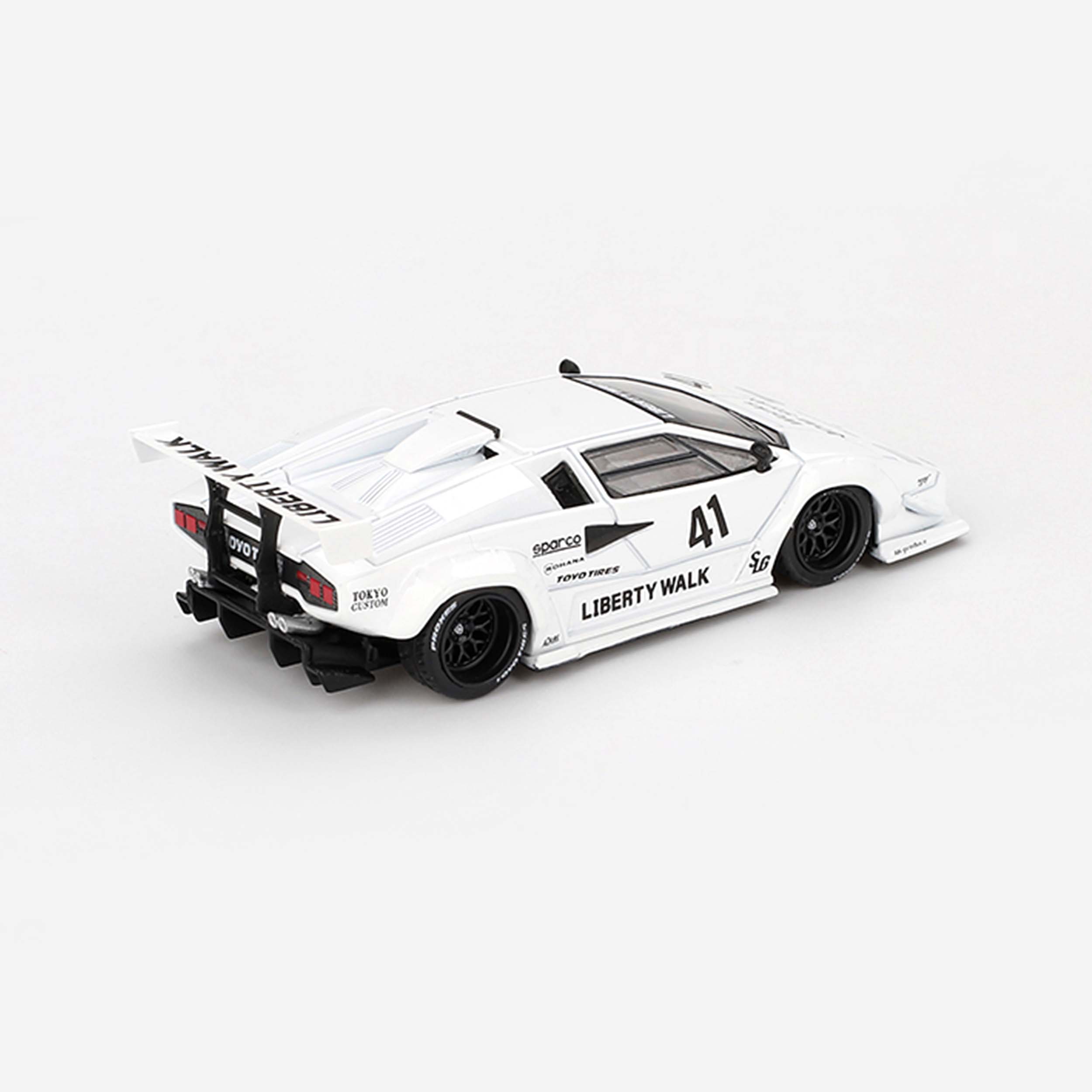 Phiên bản này nổi bật với bộ widebody Liberty Walk Super Silhouette, màu sơn trắng ngọc trai kết hợp đồ họa đen – đỏ đặc trưng, cùng decal in cực kỳ sắc nét. Xe được trang bị bánh xoay được, lò xo nhún, lốp cao su thật, tái hiện chuẩn phong cách xe độ của LB-WORKS trên nền tảng Countach cổ điển.