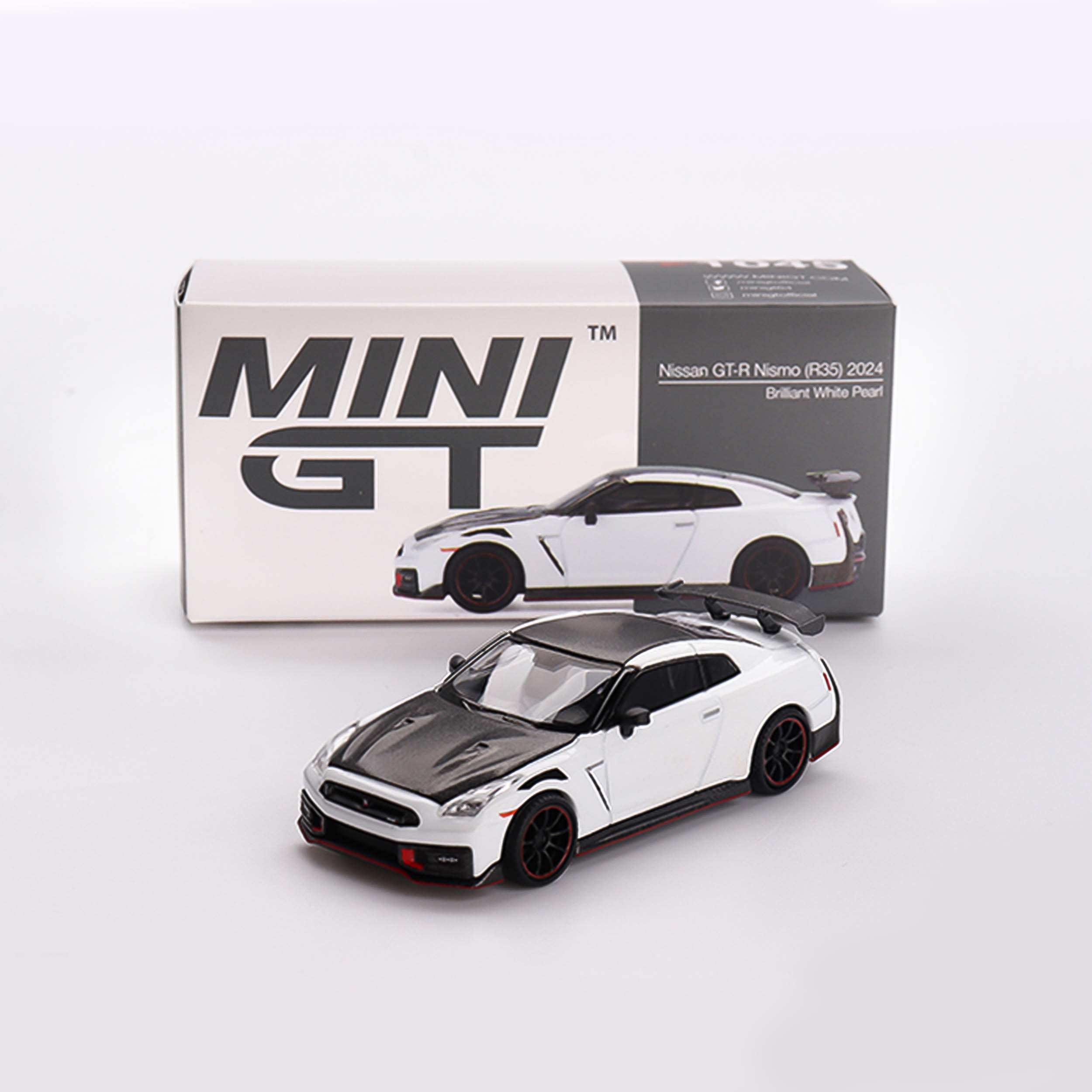 Mô hình xe tỉ lệ 1:64 do Mini GT sản xuất, mang mã sản phẩm MGT01045, tái hiện chiếc Nissan GT-R Nismo 2024 trong màu sơn Brilliant White Pearl cao cấp. Thân xe được chế tác từ hợp kim kim loại (die-cast) kết hợp các chi tiết nhựa tinh xảo, mang lại cảm giác chân thật và sắc nét trong từng đường nét. Kích thước dài khoảng 7,5 cm, phù hợp để trưng bày hoặc sưu tầm.