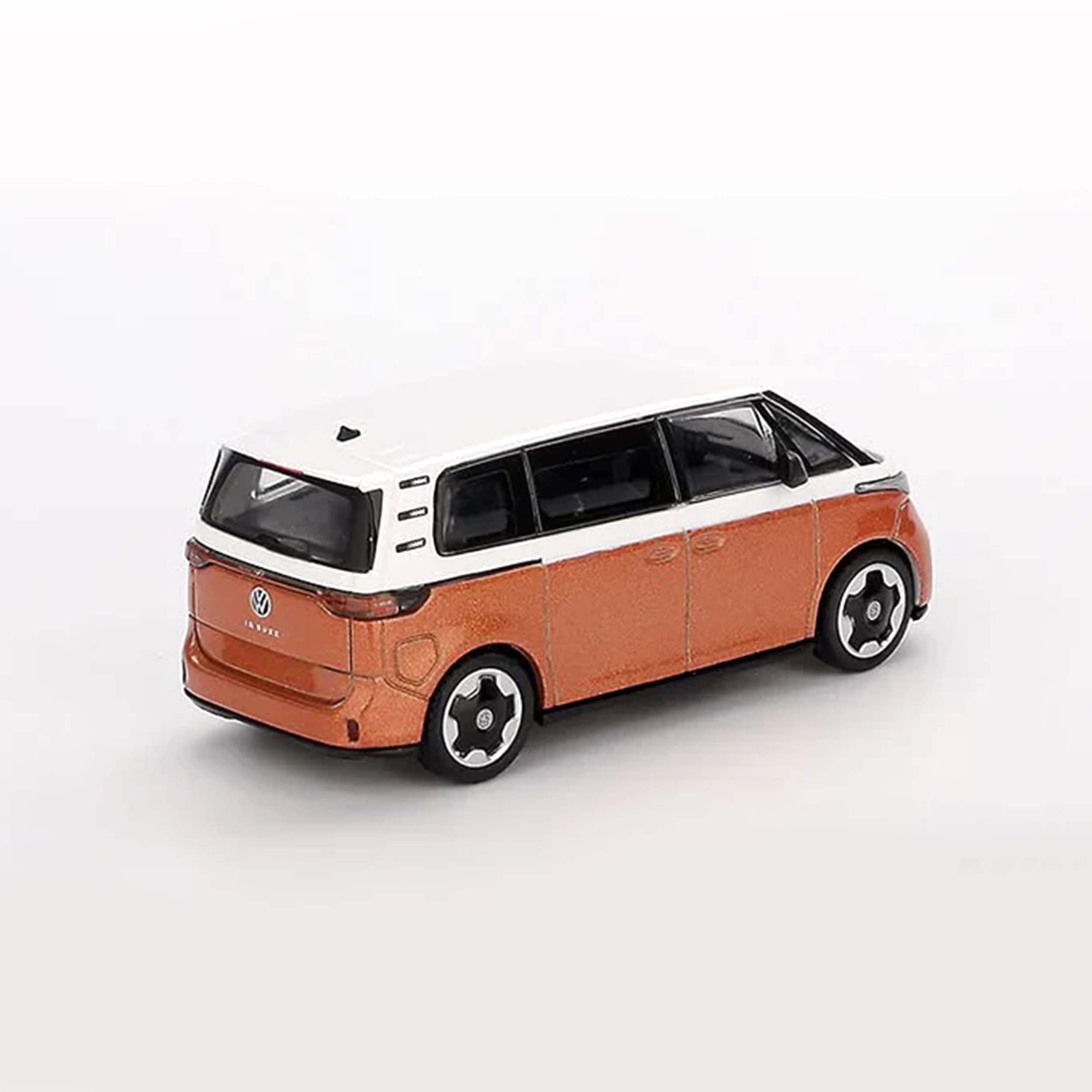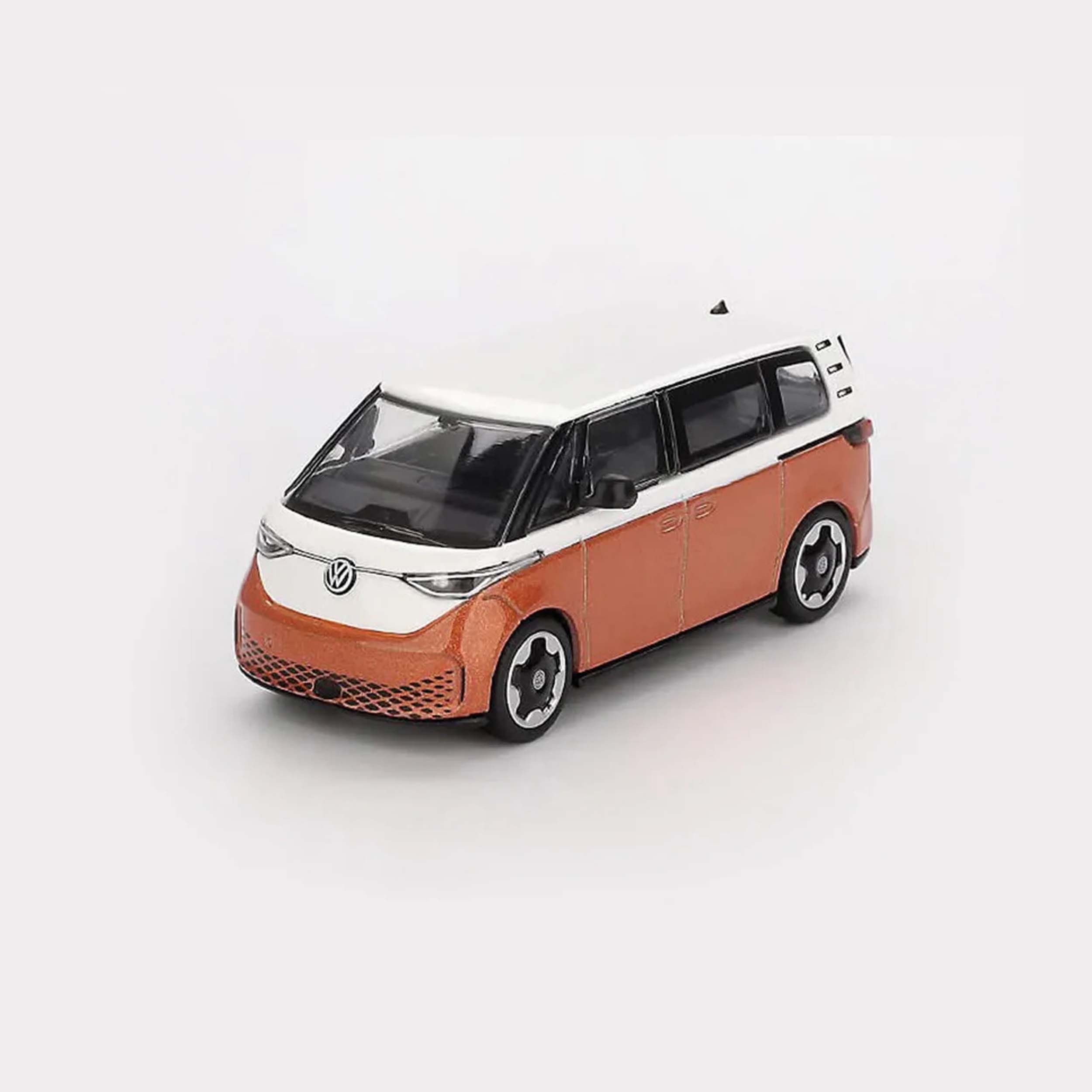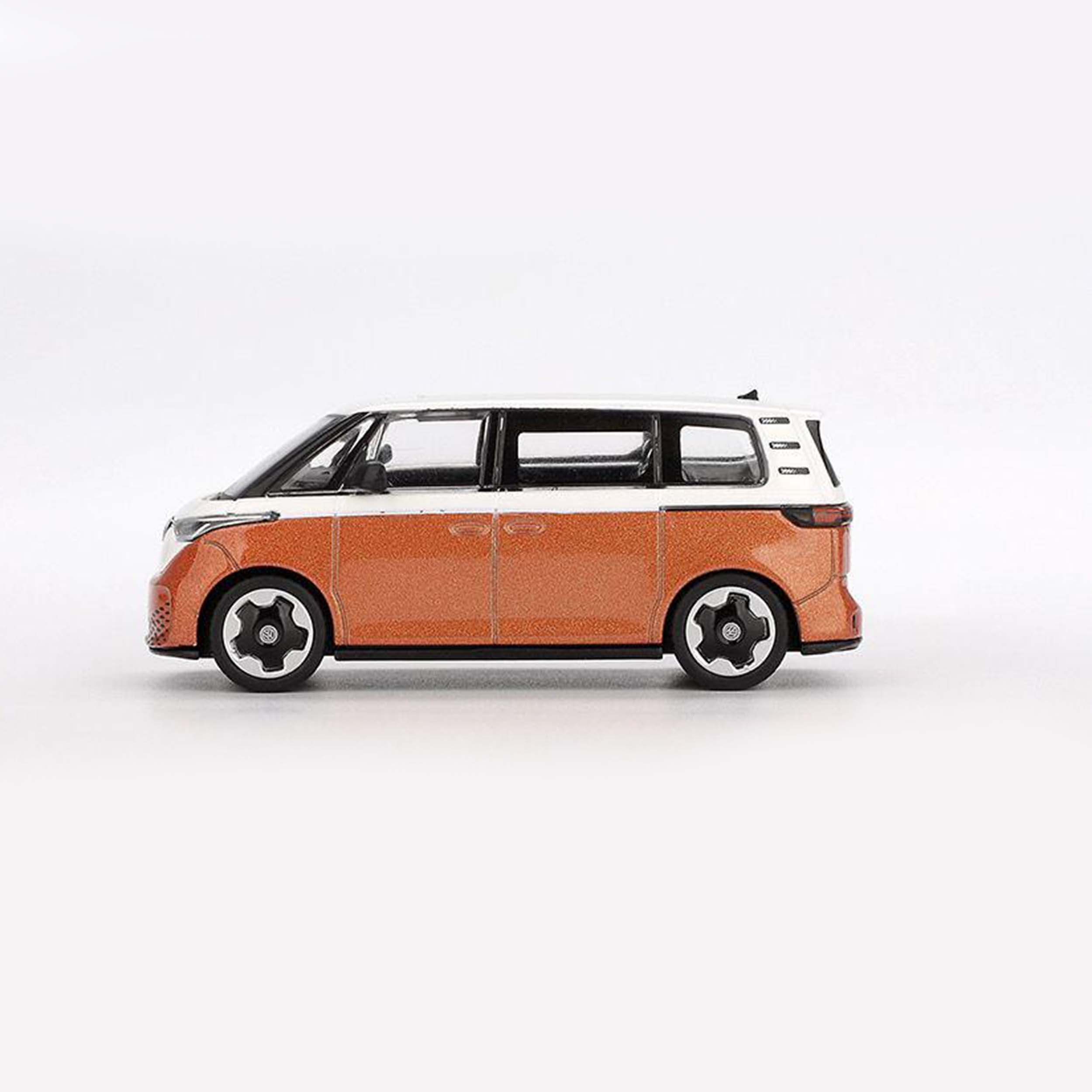 Mô hình xe tỉ lệ 1:64 do Mini GT sản xuất, mang mã MGT01061, tái hiện chiếc Volkswagen ID.Buzz với phối màu Candy White / Energetic Orange — mẫu xe điện mang phong cách retro hiện đại của thương hiệu Đức Volkswagen.