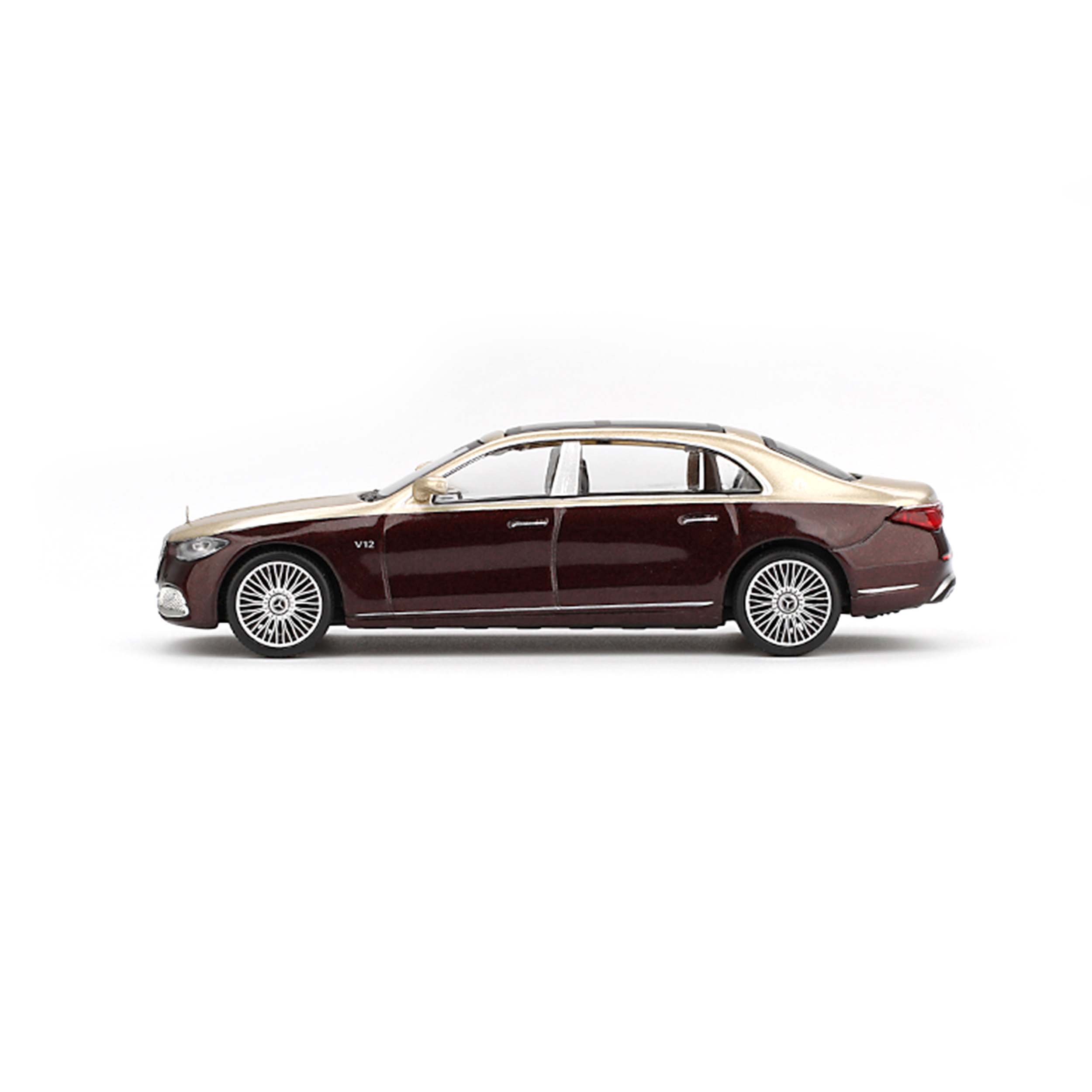 Phiên bản này nổi bật với phối màu hai tông Gold và Đỏ Đậm Metallic, thể hiện phong cách First-Class Design đặc trưng của dòng Maybach S-Class. Các chi tiết như lưới tản nhiệt mạ chrome, logo Maybach trên cột C, cụm đèn LED, mâm đa chấu và đường viền chrome quanh thân xe được Mini GT tái hiện cực kỳ sắc nét. Nội thất mô phỏng ghế da sáng màu và bảng tablo ốp gỗ giả vân cao cấp, tái hiện hoàn hảo tinh thần sang trọng và quyền lực của dòng xe siêu sang Đức.