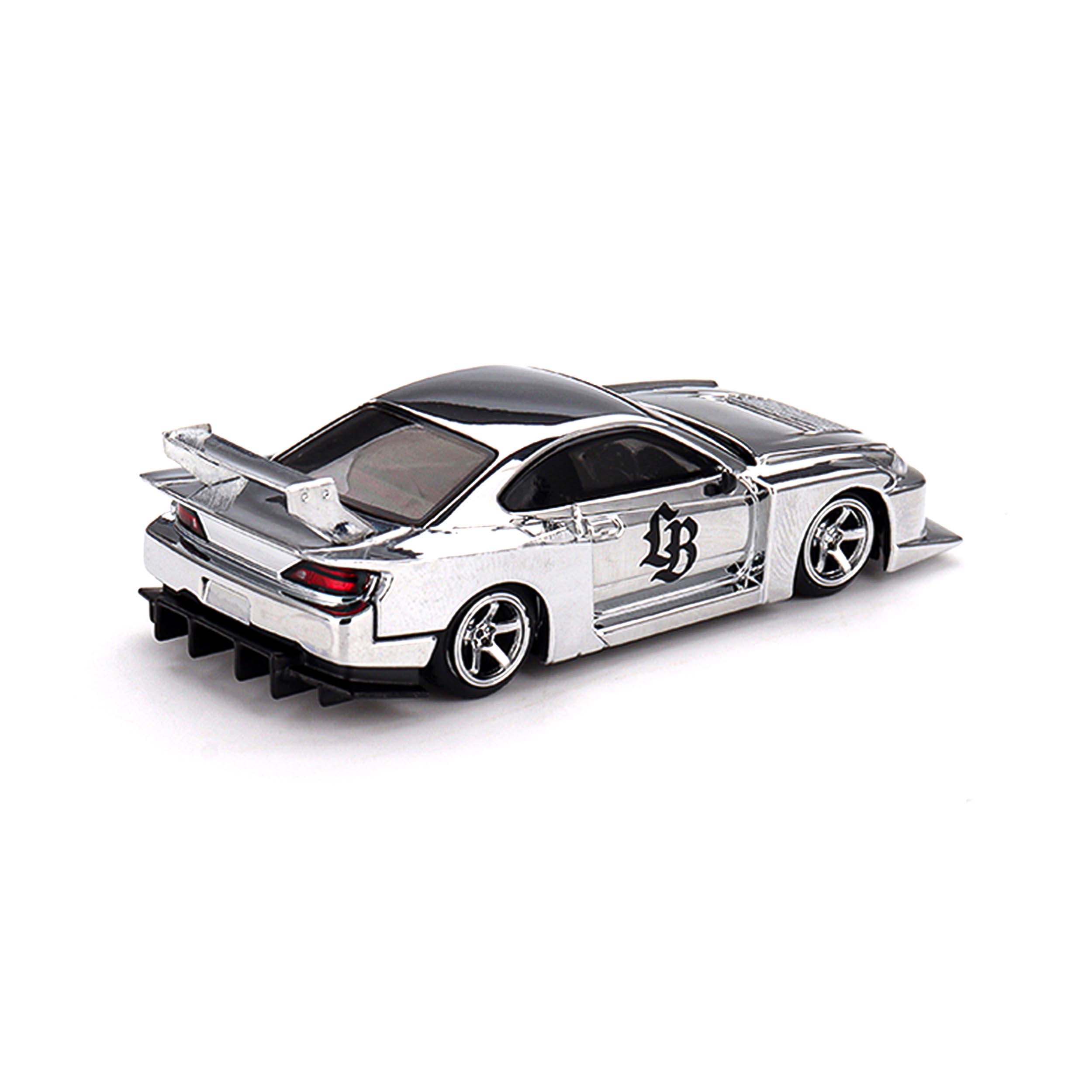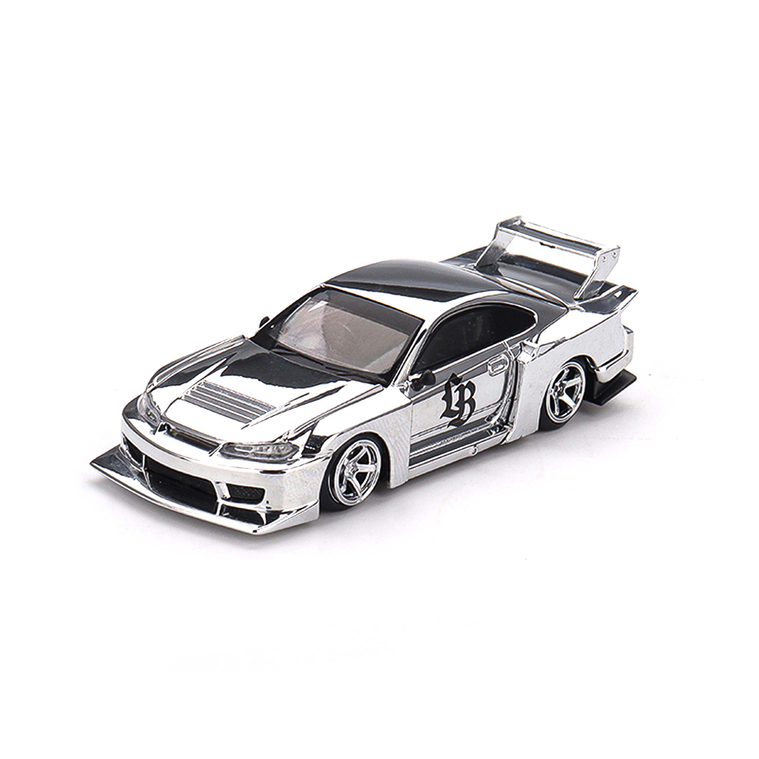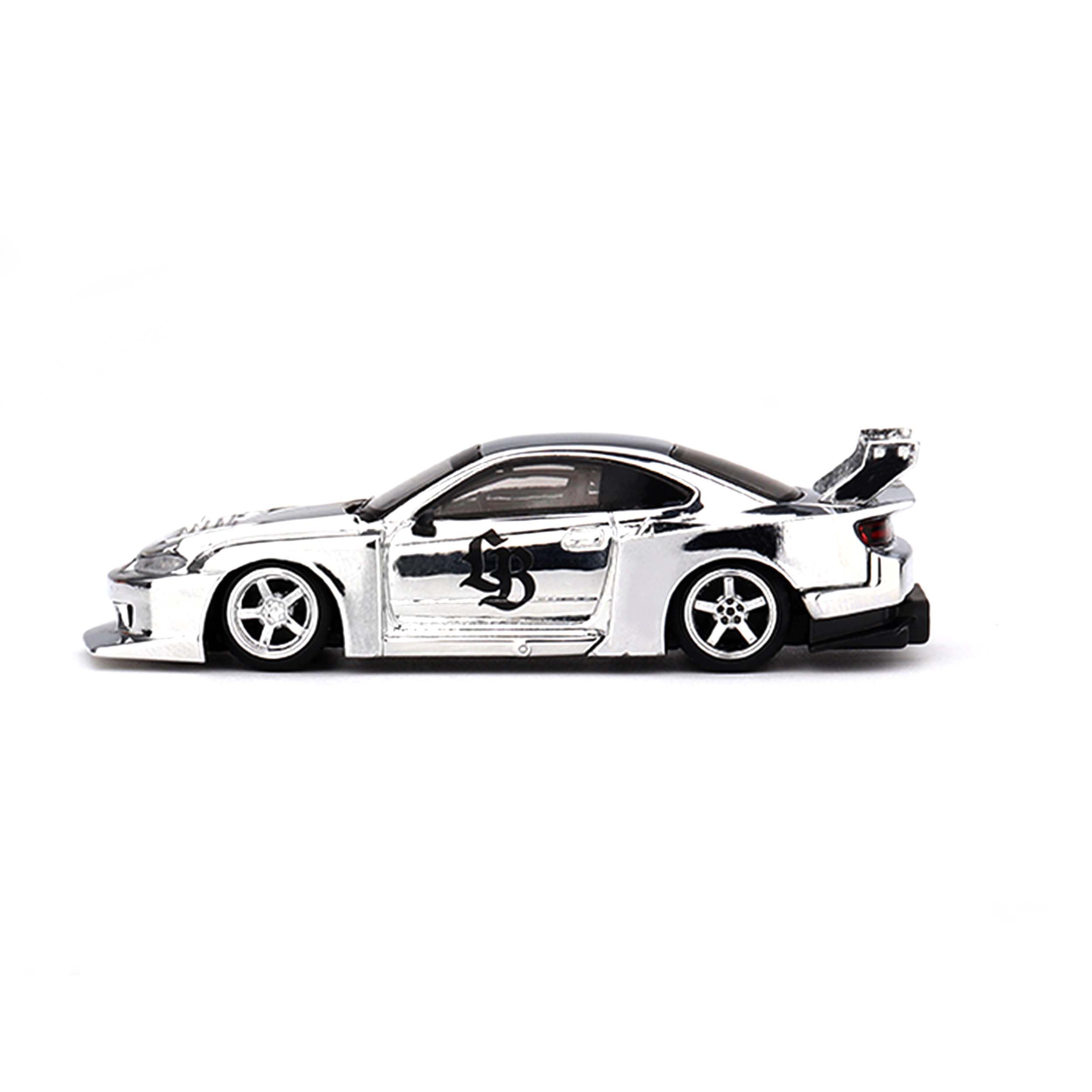 Phiên bản này mô phỏng Nissan Silvia S15 Spec-R, biểu tượng drift Nhật Bản cuối thập niên 1990. Xe mang màu sơn Chrome Silver ánh gương – hiệu ứng phản sáng độc đáo, kết hợp mâm đen thể thao, đèn pha trong suốt, và cụm đèn hậu tròn đôi được Mini GT tái hiện cực kỳ chi tiết. Các đường gân thân, logo “Silvia” và chi tiết bodyline được làm sắc nét đến từng milimet.