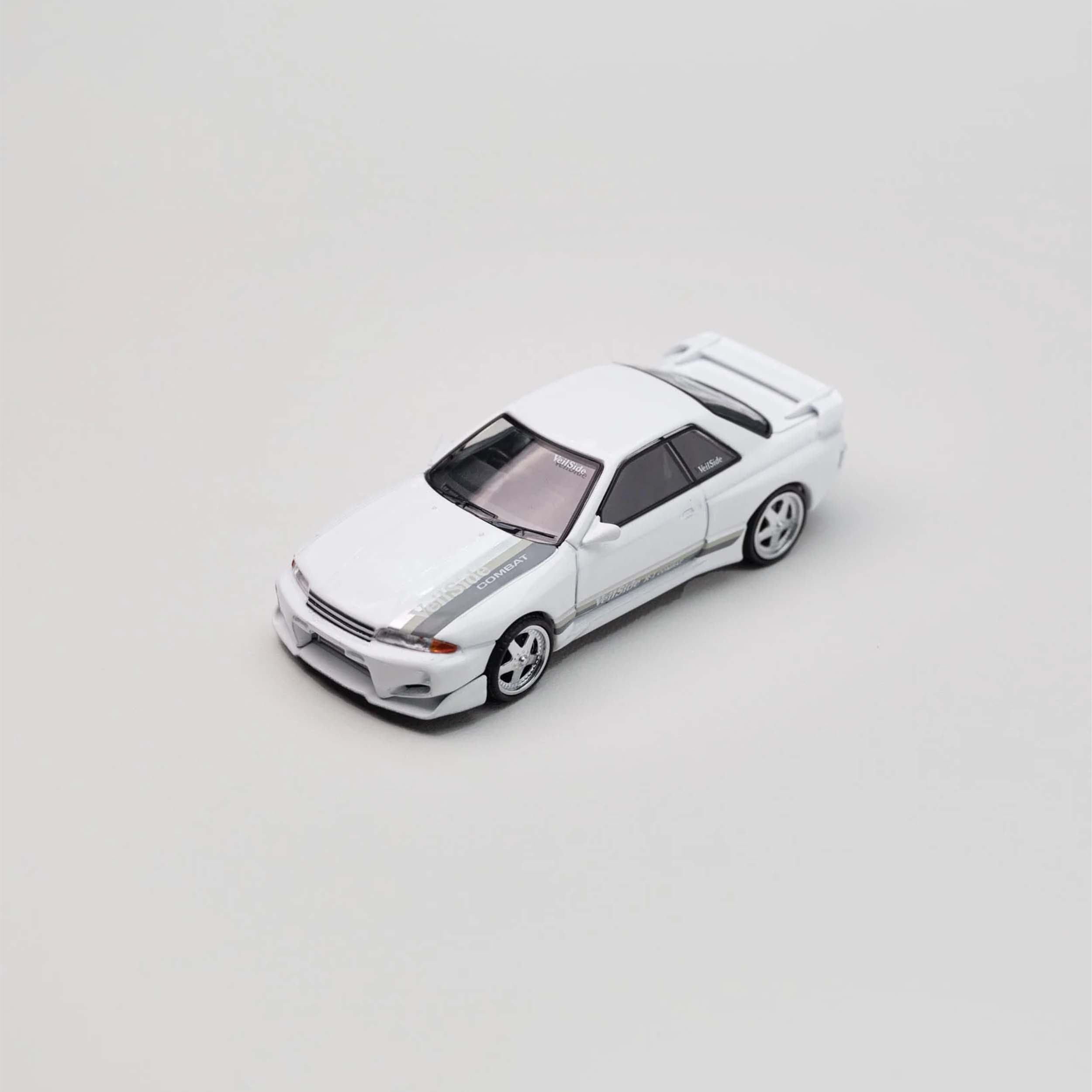 Mô hình xe tỉ lệ 1:64 do Mini GT sản xuất, mang mã MGT01066 (Card Version), tái hiện chiếc Nissan Skyline GT-R (R32) VeilSide Combat C-I màu Trắng — mẫu xe độ JDM huyền thoại của thương hiệu VeilSide.
