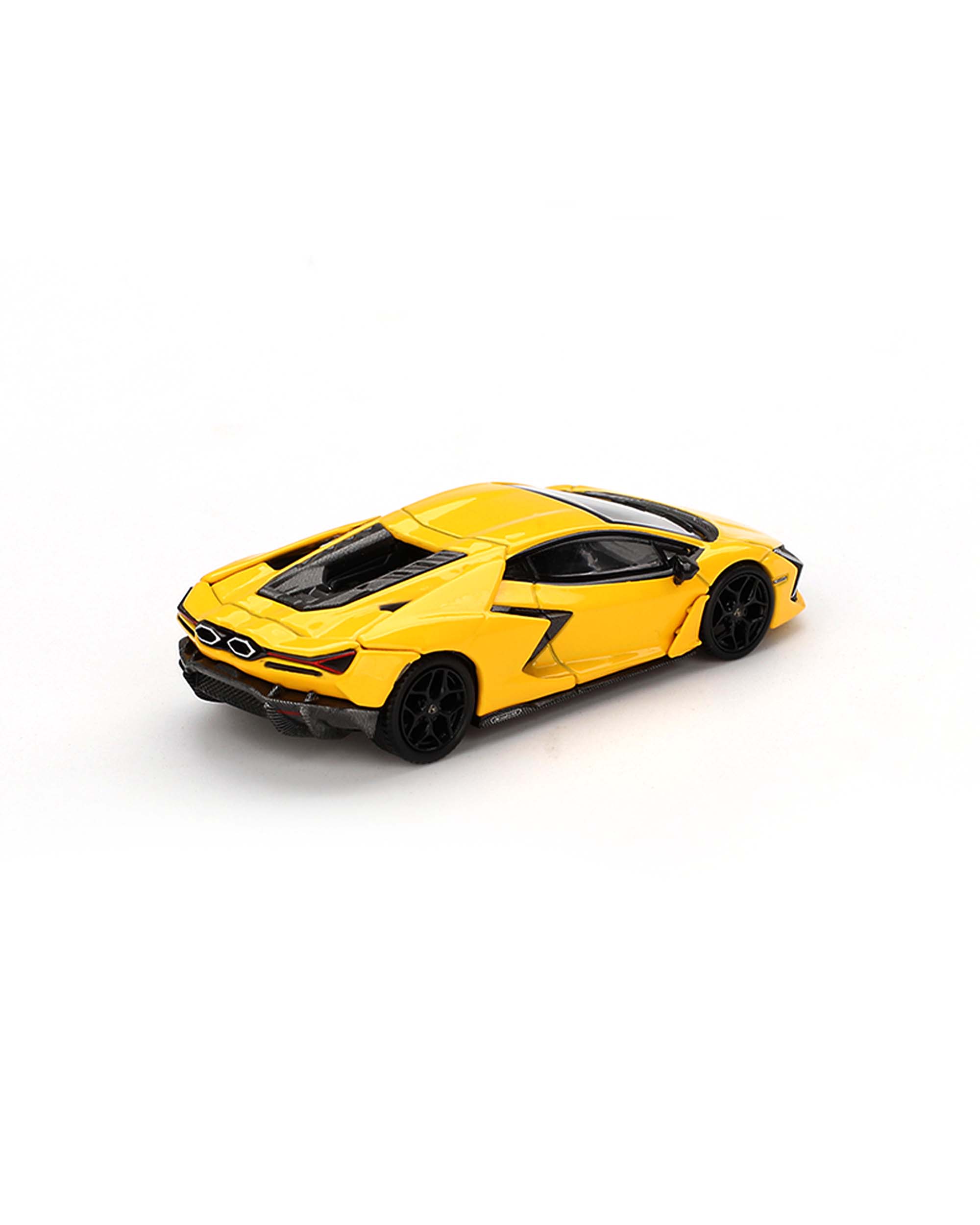 - Revuelto là sự kết hợp táo bạo giữa thiết kế tương lai và công nghệ điện hóa, với khối động cơ V12 hybrid mạnh mẽ. Mẫu mô hình thể hiện trọn vẹn DNA thiết kế đặc trưng của Lamborghini: các đường cắt xẻ góc cạnh, hốc gió cực lớn, đèn LED hình chữ Y, mâm thể thao thiết kế mới, cùng phần đuôi xe khí động học đầy ấn tượng. Tông vàng Giallo đặc trưng khiến chiếc xe nổi bật như một mũi tên ánh sáng trên đường đua.