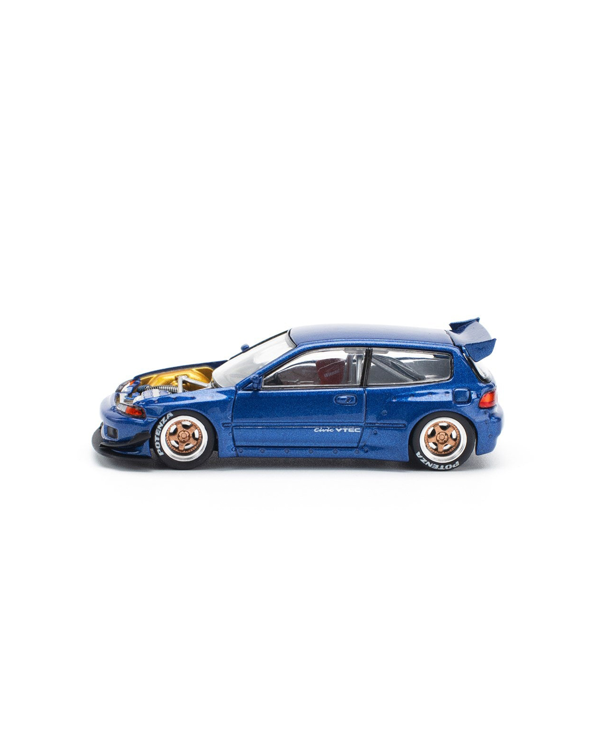 Mô hình xe tỉ lệ 1:64 do PopRace sản xuất, mã PR640174, tái hiện mẫu Honda Civic EG6 độ full widebody Pandem (Rocket Bunny), mang phong cách đường phố – đua JDM đặc trưng của thập niên 1990.