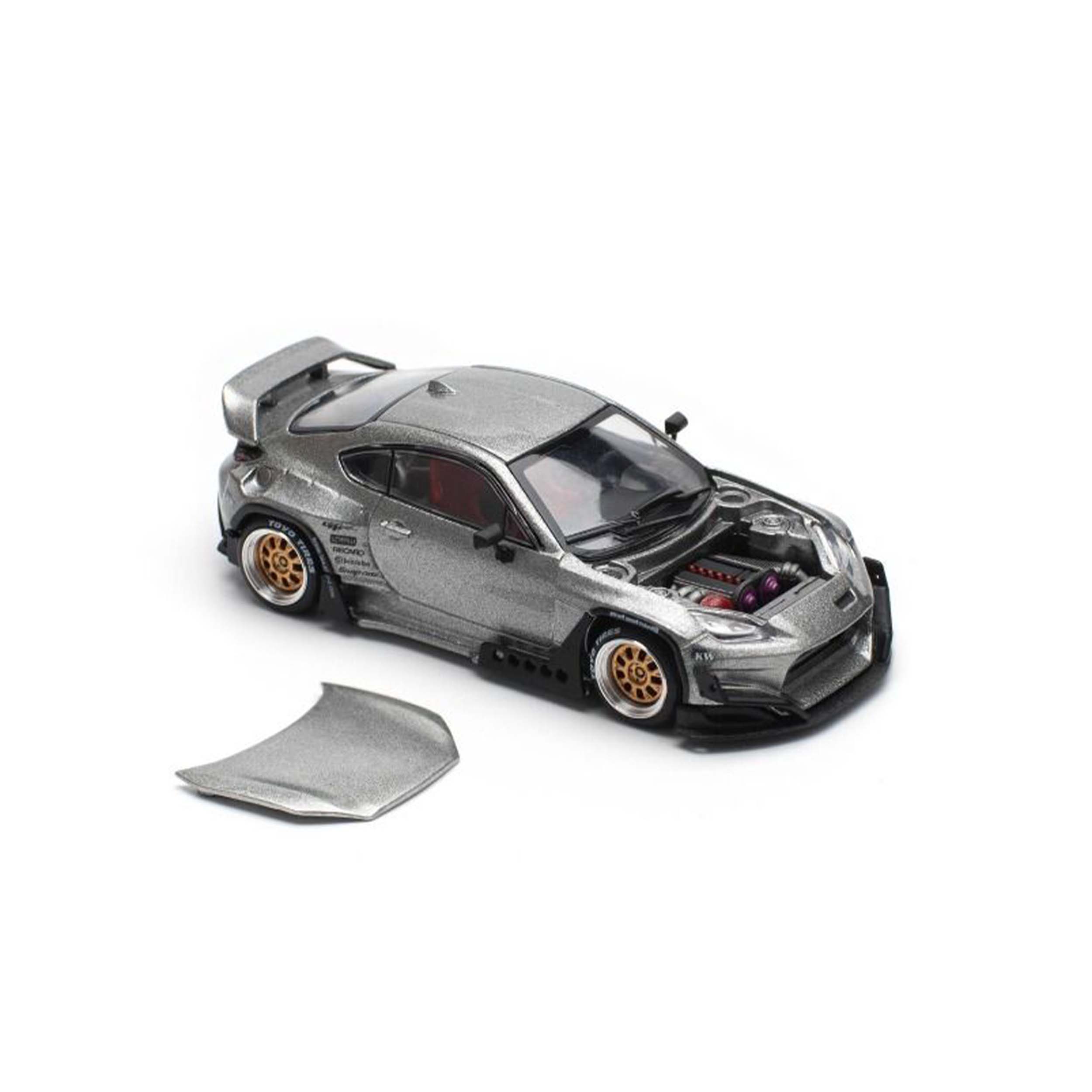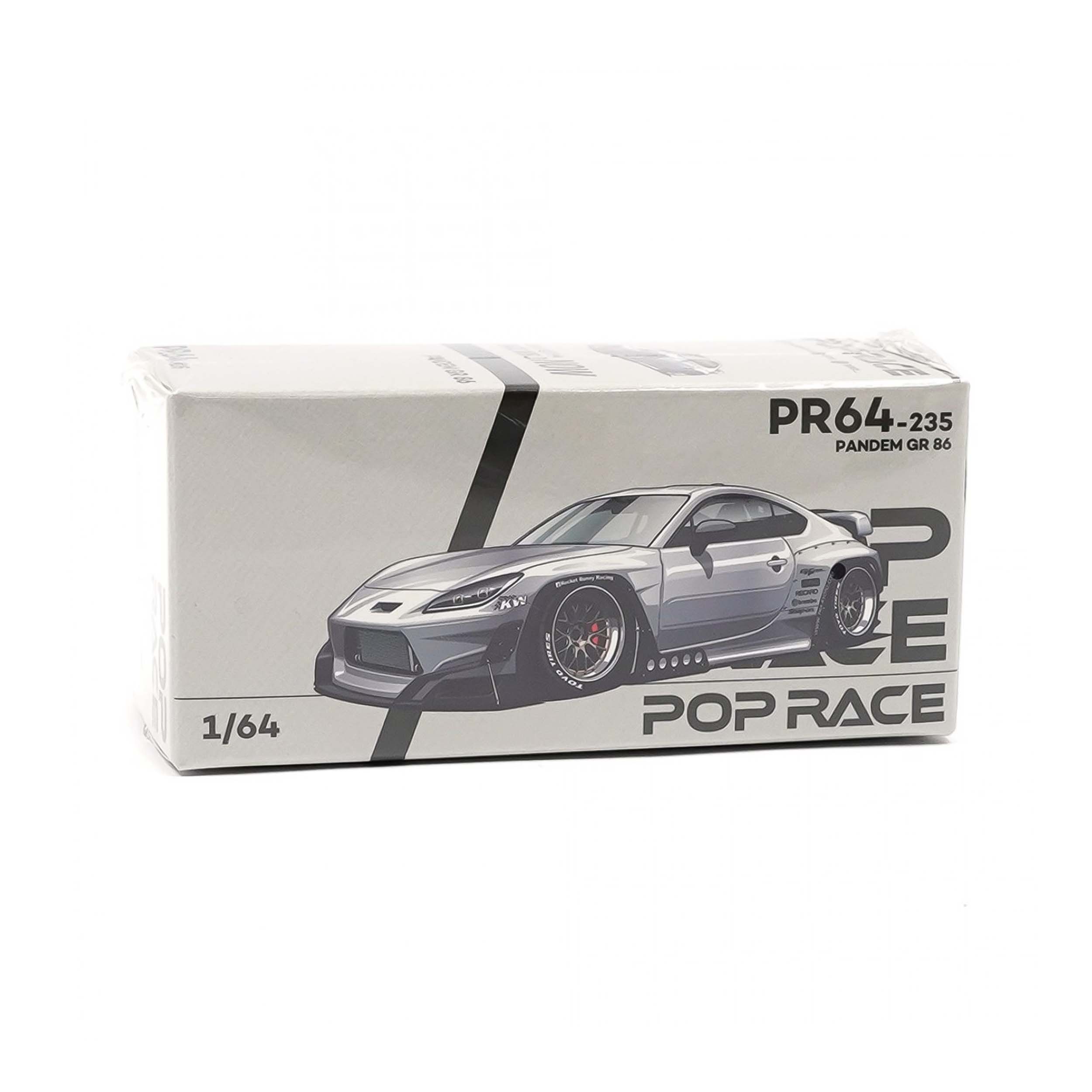 Mô hình xe tỉ lệ 1:64 do PopRace sản xuất, mang mã PR640235, tái hiện chiếc Toyota GR86 độ widebody PANDEM với màu sơn Silver Metallic – mẫu độ hiện đại mang đậm tinh thần JDM.